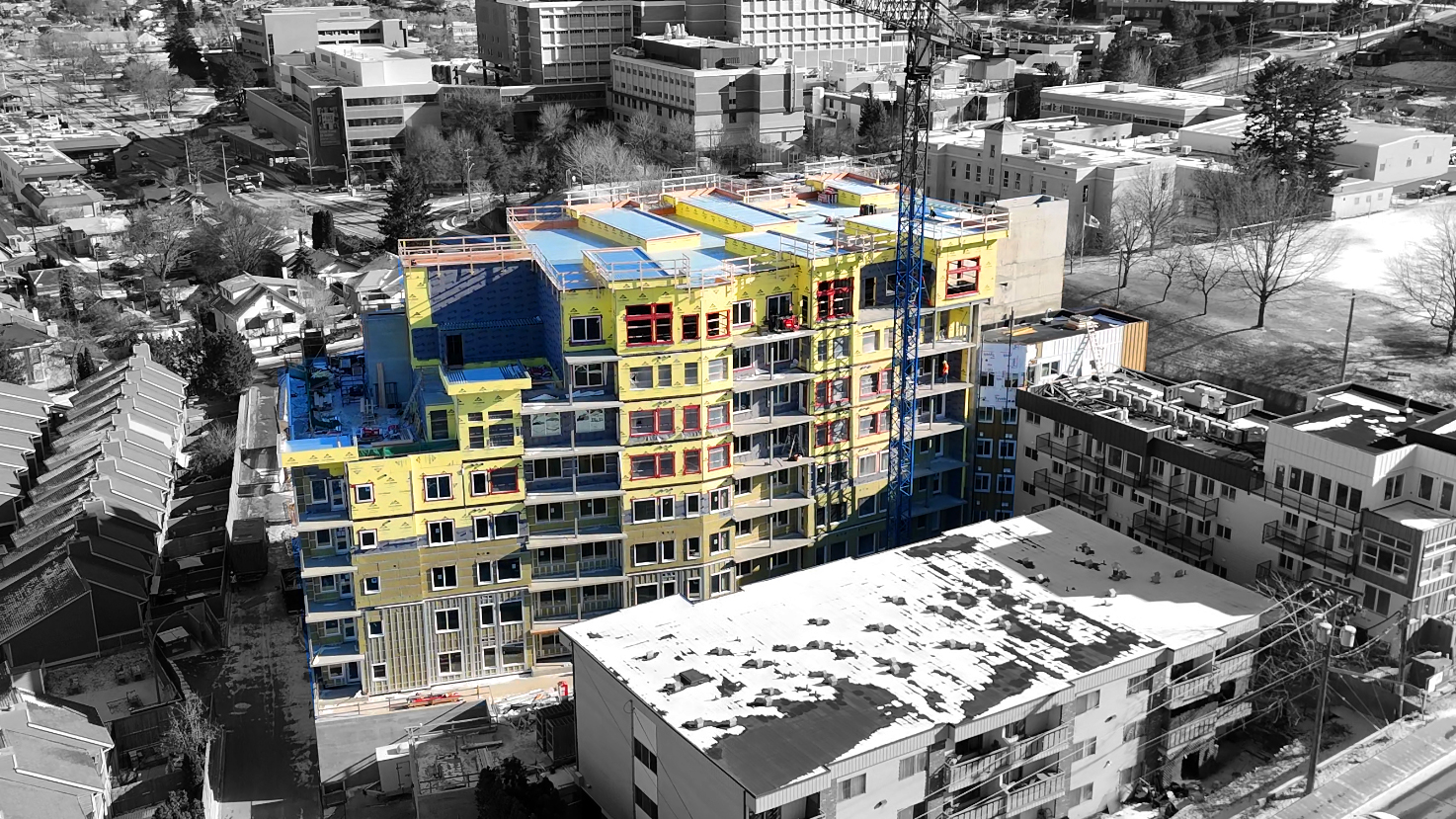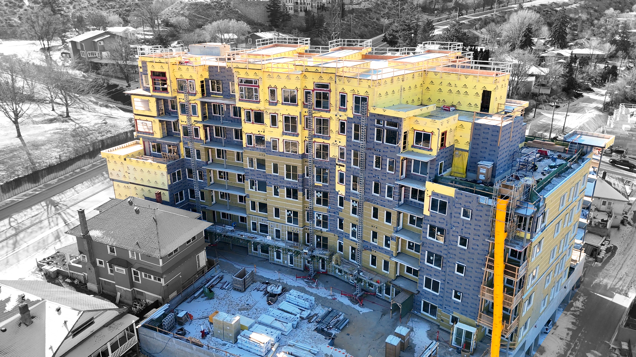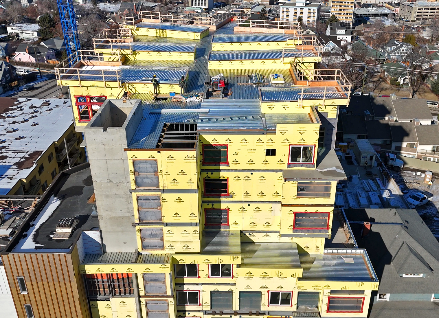The structure features a load-bearing steel stud system integrated with a composite floor assembly, along with precast and cast-in-place balconies below. Numerous overhangs, step-ins, occupied roof areas, cantilevers, and pop-up roof elements introduced significant structural and detailing complexity.