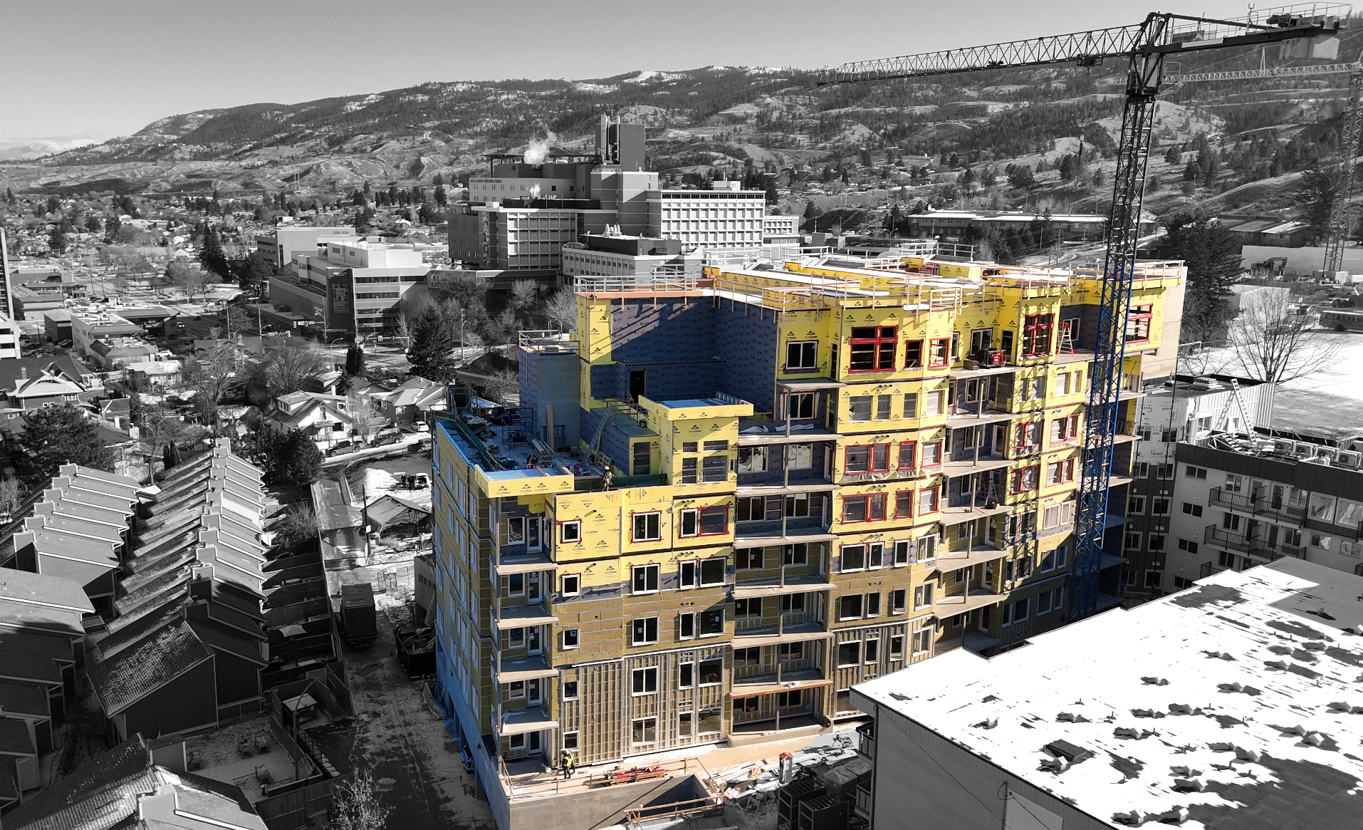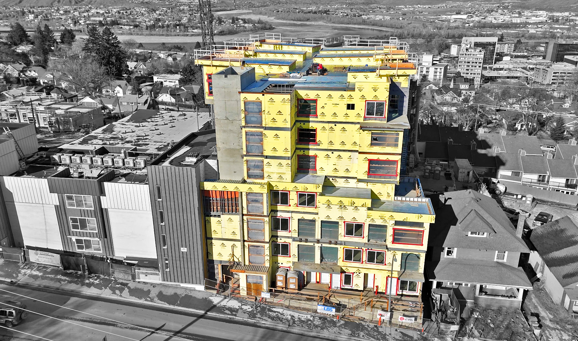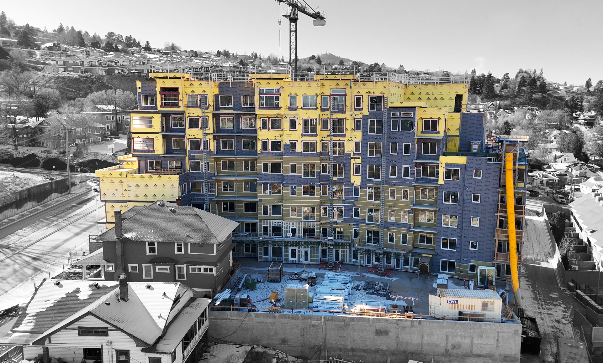 The structure features a load-bearing steel stud system integrated with a composite floor assembly, along with precast and cast-in-place balconies below. Numerous overhangs, step-ins, occupied roof areas, cantilevers, and pop-up roof elements introduced significant structural and detailing complexity.