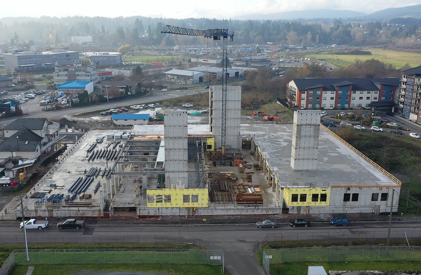 This 6-storey, 210-unit building has begun with the installation of the LBS superstructure, with concrete cores established and steel assemblies progressing steadily across the site.